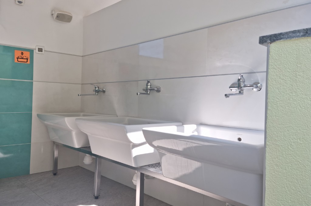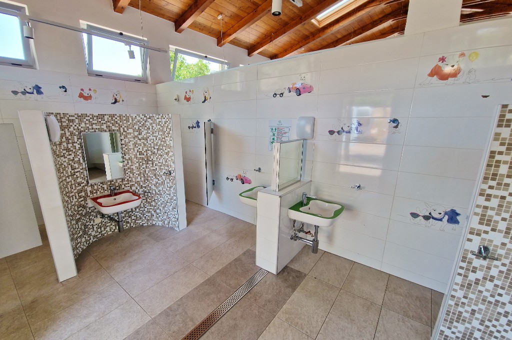 Sanitarni objekti rasprostranjeni po cijelom kampu. Uz standardnu opremu visoke kvalitete, pronaći ćete i dječje sanitarije i prostorije za presvlačenje dojenčadi, kupaonice prilagođene osobama s posebnim potrebama, prostorije za pranje rublja (perilice rublja,sušilice rublja - prodaja žetona na recepciji) i posuđa te prostorije za pražnjenje kemijskih toaleta.